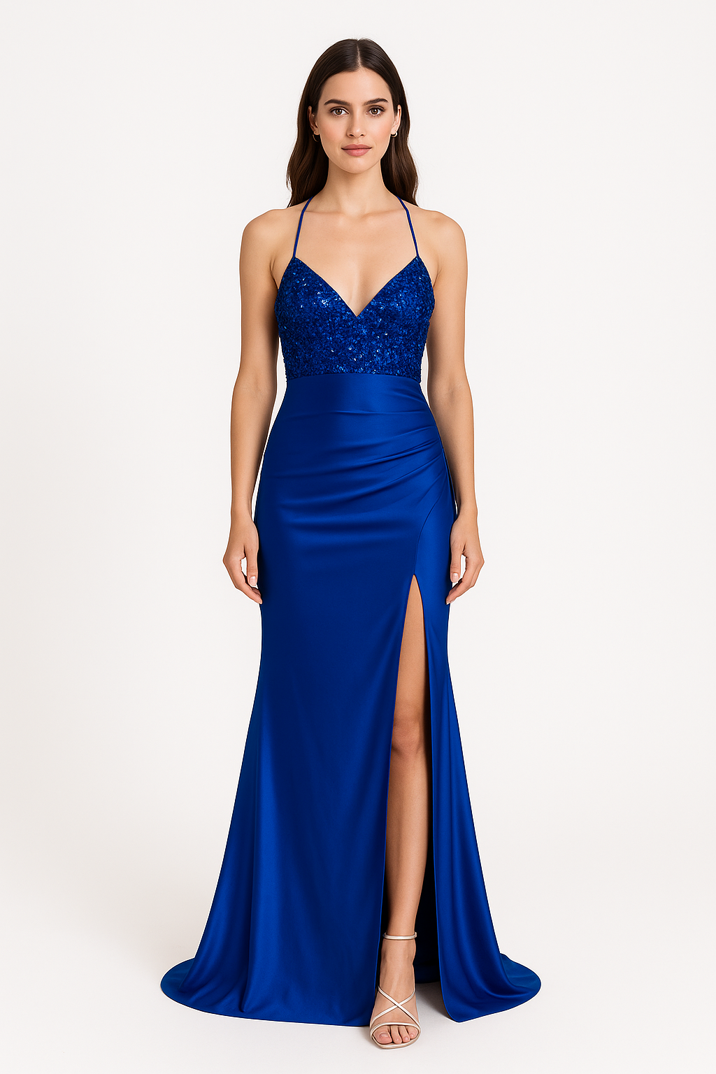 Command attention in our Royal Blue Sequin Slit Gown, a striking piece that combines glamour with modern sophistication. Featuring a shimmering sequin bodice with a deep V neckline and delicate thin straps, this gown flows into a sleek satin skirt with a daring thigh-high slit. Perfect for galas, formal evenings, or red-carpet occasions, it is designed to make every entrance unforgettable.